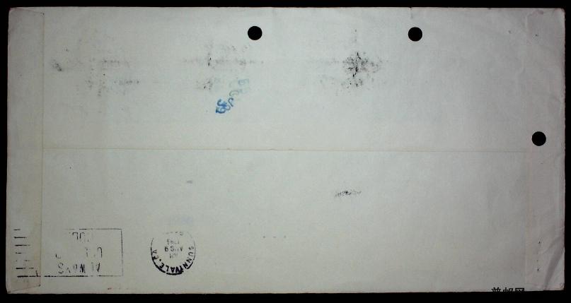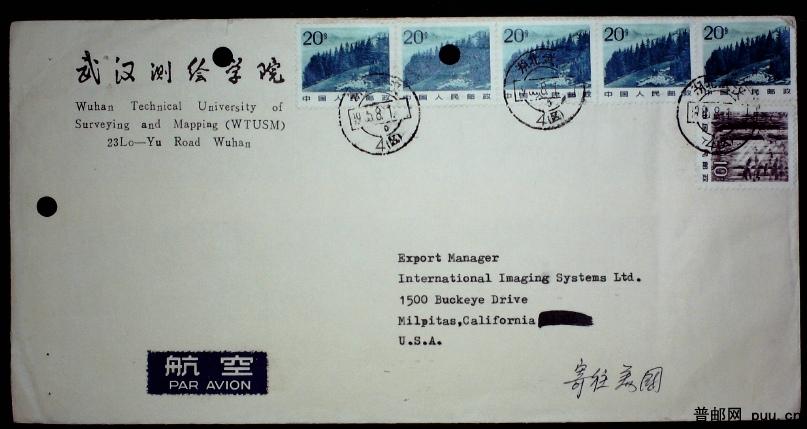1985年贴普22 20分 10分票武汉寄美国航空实寄封一枚