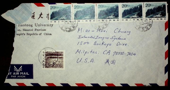 1986年贴普22 20分 10分票陕西西安寄美国航空平信实寄封一枚
