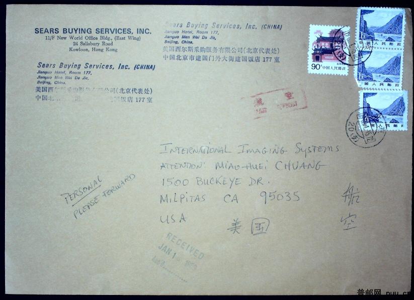 1989年贴居民90分普 21 1元票 北京航空寄美国实寄封一枚