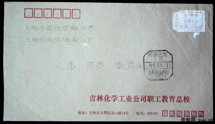 1993年吉林省吉林市大字快件八角戳实寄封一枚