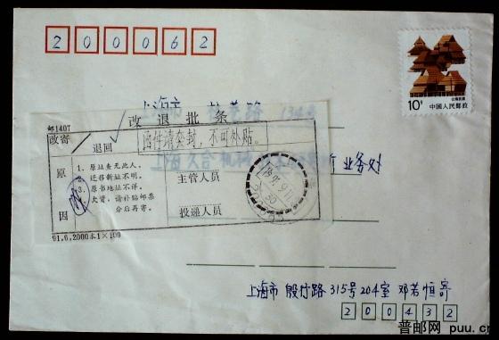 1991年上海改退封加盖“函件清套封,不可外贴”拒收退回实寄封