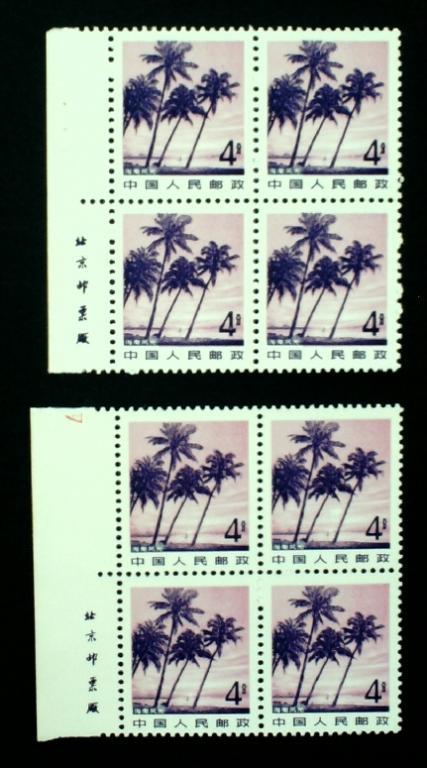 普22 4分海南风光P11.5*11组外品左下厂铭四方联及正常齿孔同位置厂铭四方联各一件