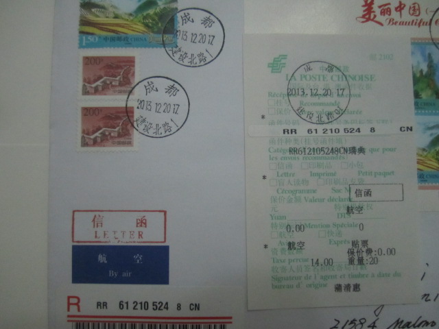 12月20日《美丽中国小全张》成都挂号邮寄瑞典附带机打收据