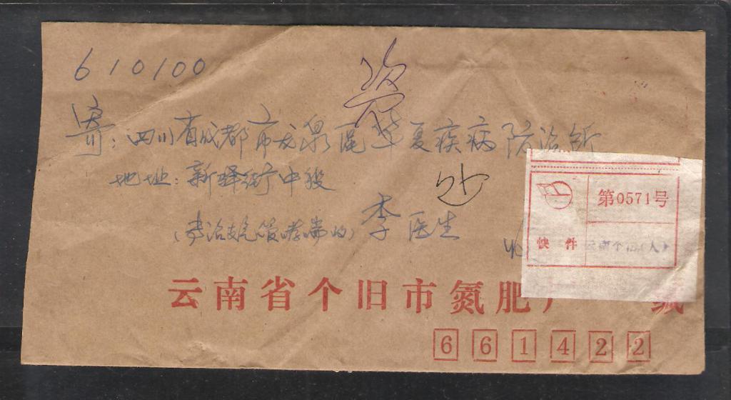 89年快件实寄封1件(贴普21;8分细齿4枚)