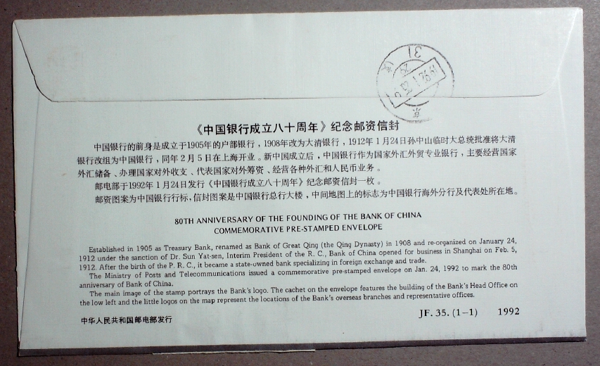 JF35中国银行成立八十周年纪念总公司首日本埠挂号实寄封【本埠少】