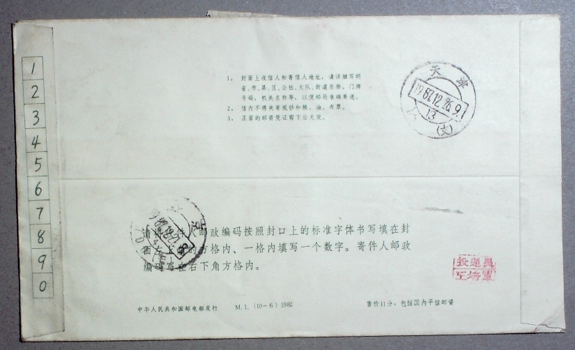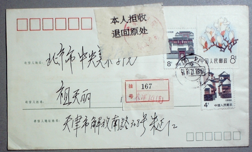 1987年M1(10-6)加贴民居普票天津寄北京拒收实寄封一枚