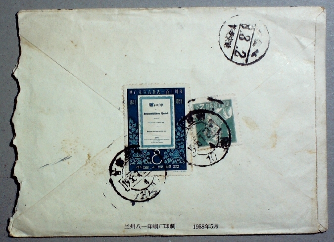 1958年7月贴共产党宣言老纪特票甘肃兰州寄黑龙江肇东宋站小地名实寄封一枚
