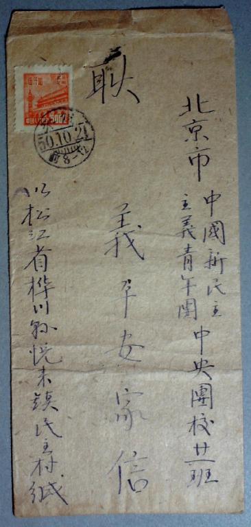 1950年贴贴普东1 5000元一枚松江省桦川县悦来镇寄北京实寄封一枚