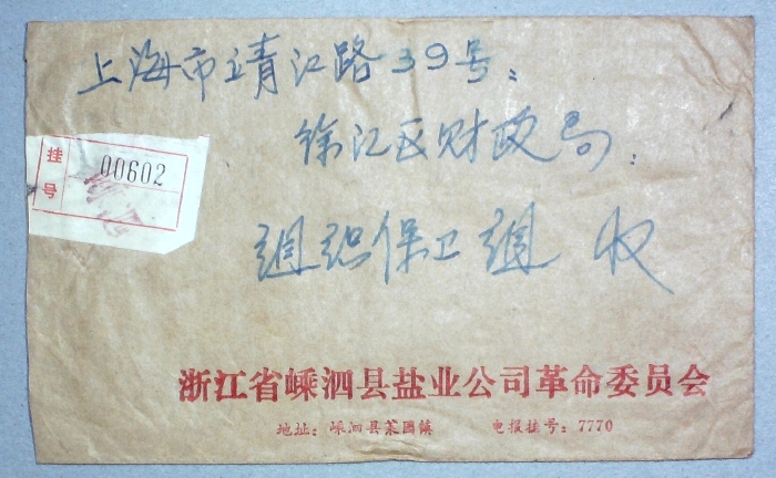 1976年贴普16 3分厂铭联票浙江嵊泗寄上海挂号实寄封一枚