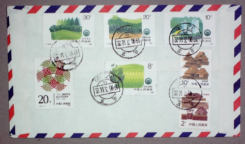 1990年贴T148绿化祖国全套及其他票北京寄德国实寄封一枚