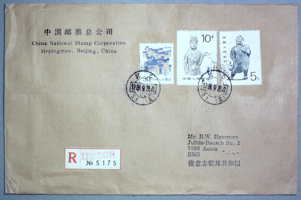 1989年贴普24 5元、10元各一枚及普23 30分粗齿票一枚北京寄德国挂哈实寄封一枚
