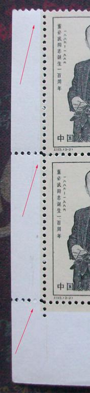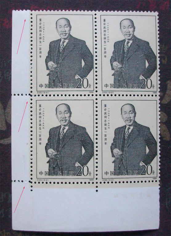 J123 董必武 20分 左下角厂铭方联 纸边齿孔与票齿孔移位