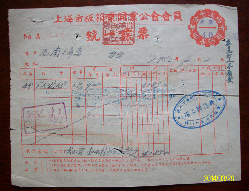 `1952 上海市板箱业同业公会会员统一发票 税票5枚 之5