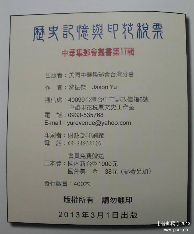 台湾《历史记忆与印花税票》2013年3月1日出版定价新台币1000元