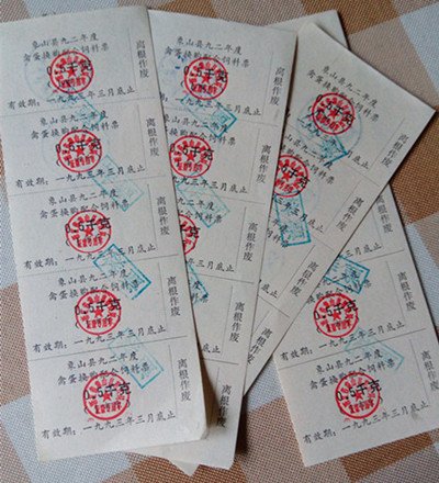 象山县1992年禽蛋换购配合饲料票加盖(样票)章