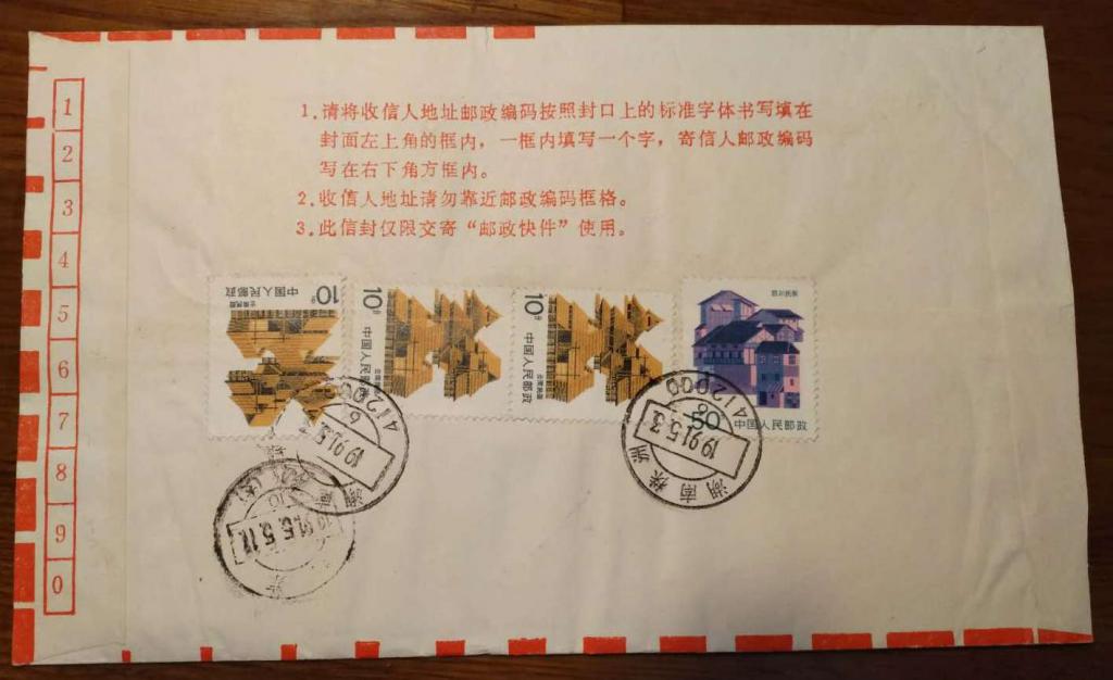 1991年贴多枚云南民居套色及齿孔移位票快件实寄封1枚
