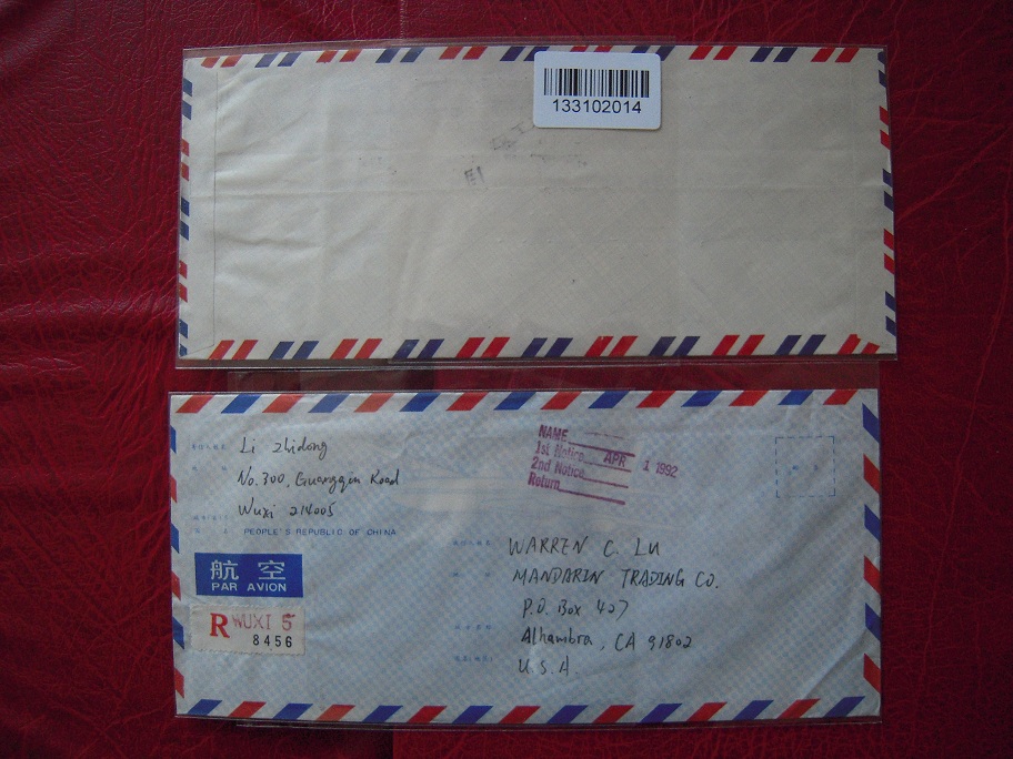 贴普23(1元1.1元2元)1992年航空挂号寄美国实寄封2枚