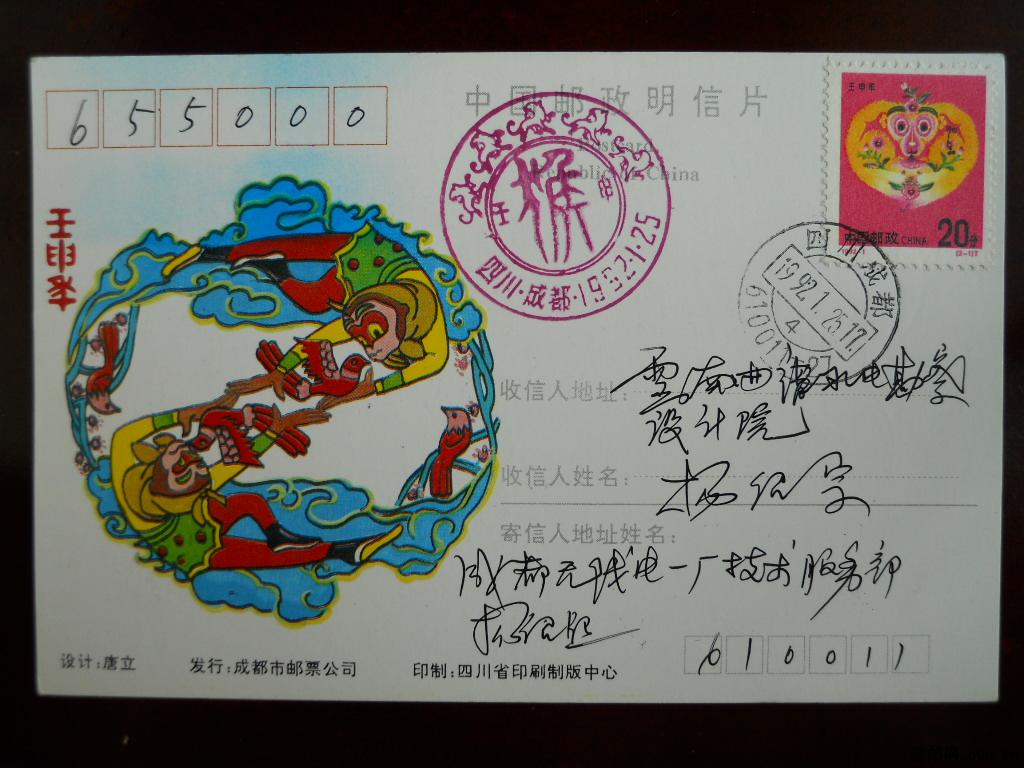 成都市邮司92年猴错片-实寄