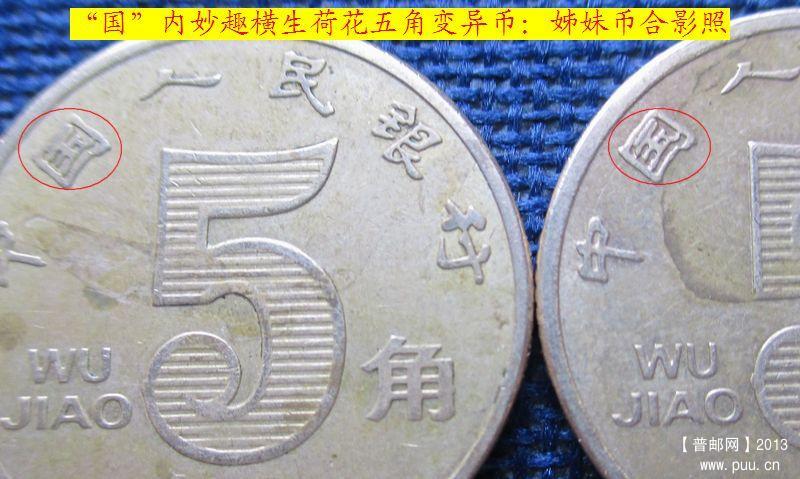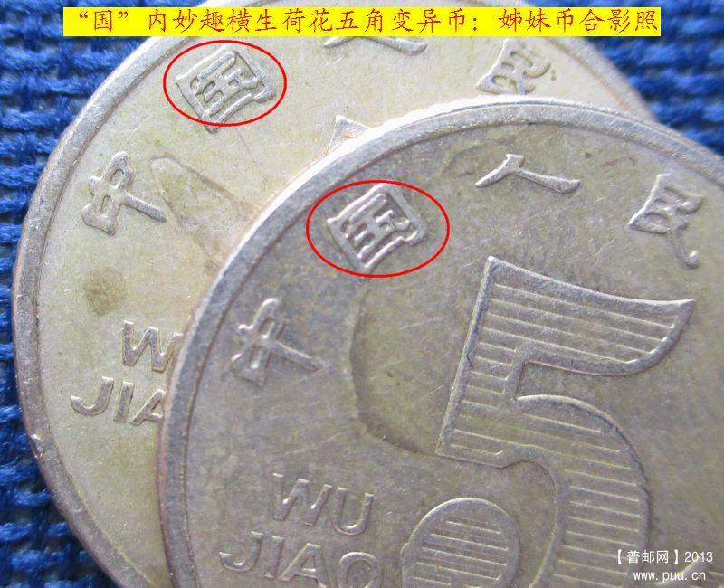 整理变异币时,突然发现2004年荷花五角硬币“中国人民银行”的“国”内多一横。始欲命名“国内一横压王上”“国内横生王上”,思之良久,觉不妥,终冠名“国内妙趣横生荷花五角硬币”。