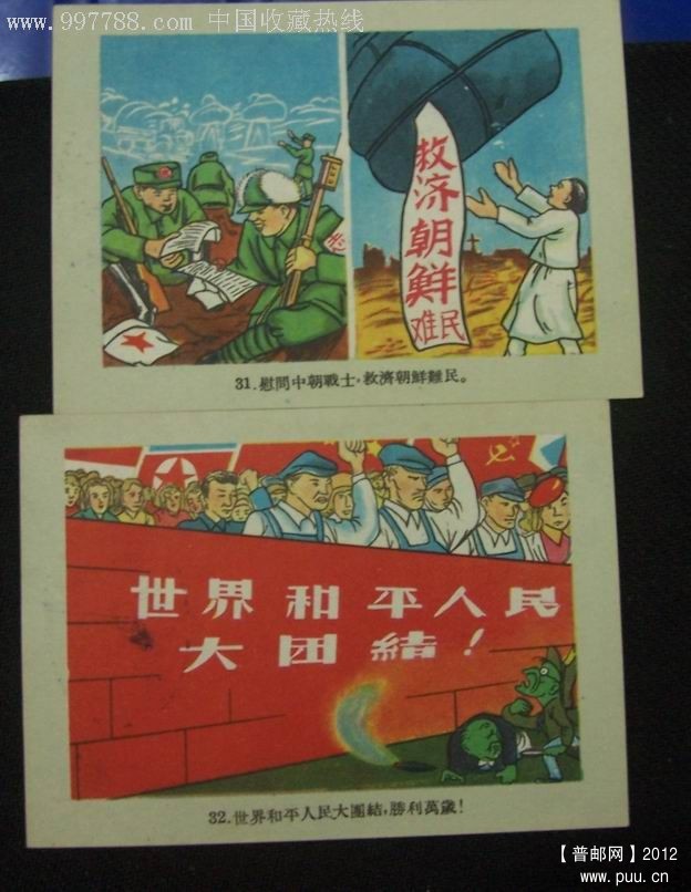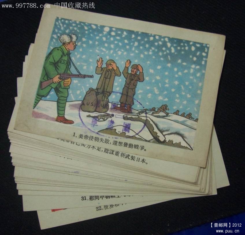 2011年6月14日,有2套1951抗美援朝宣传画明信片各32全(都有腰条),在网上开拍,起价84元,递增价每次25元,吸引了无数网友的眼光,历时11个月的马拉松竞拍长跑,昨天5月29日终于结拍了! 一套全品的竞价388次,结拍价16450元;一套略微品差些的于今年4月12日,经385次竞价,结拍价14020元,分别被广东和北京的网友收藏! 因竞价激烈,本店在今年春节后提前告退出局,希望马拉松竞拍长跑早点结束,从夏到秋、到冬、到春、又到夏了--。这2套难得一见的原版套片出自四川叙永县老货坊,现记录在这里!