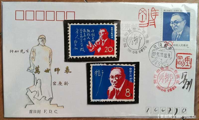 J183陶行知诞生100周年安徽歙县原地首日封,中部放置的是马刚老师的邮票设计初稿。首日封同时加盖红黑两枚安徽歙县原地纪念戳,歙县首日销信戳,马刚老师亲笔签字并加盖两枚印章。更多精品请见博客邮来邮网 http://www.chinau.cc/home/space.php?uid=48