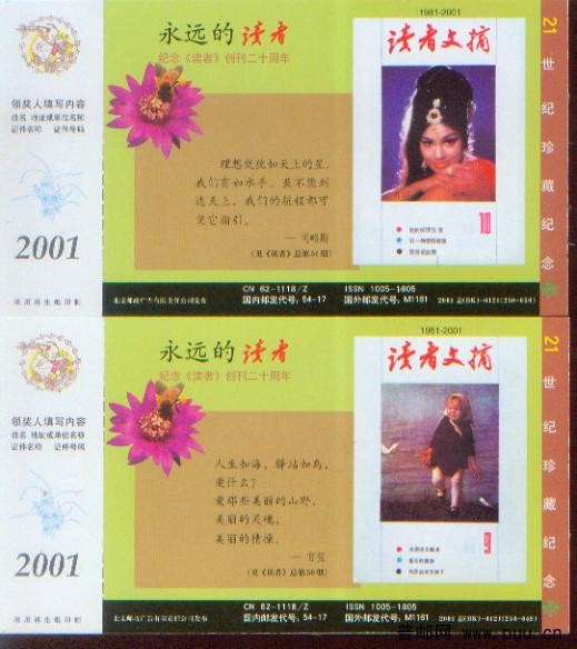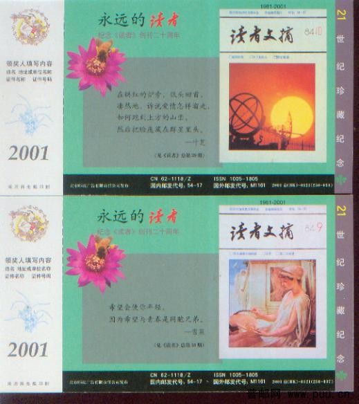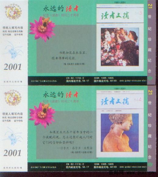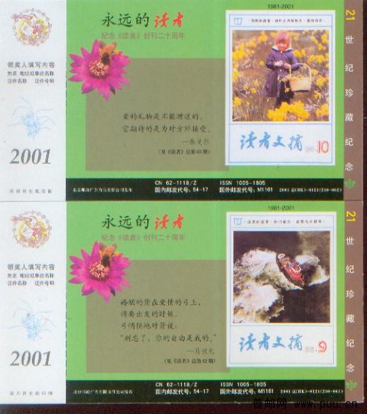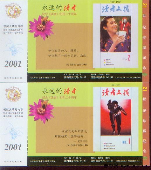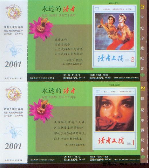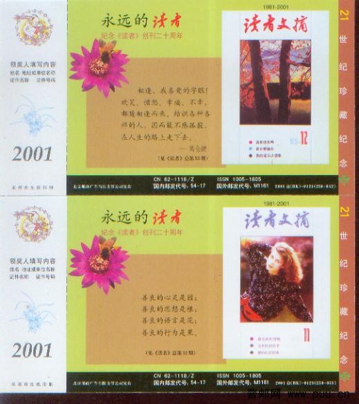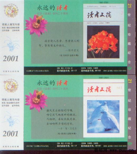 这套明信片由读者杂志社设计,国家邮政局发行,在2001年荣获贺卡大套类金奖,该套明信片延续《读者》杂志的一贯风格,将全年所发行的每一本杂志都对应一张明信片,使人们很容易地回想起杂志与读者一起走过的历程,同时,这套明信片也将成为研究《读者》历史、收藏企业文化的文化收藏品。