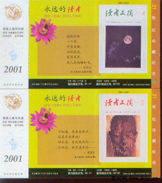 明信片上印制的有“纪念《读者》创刊二十周年”字样,每张明信片都包含《读者》杂志的封面,从《读者》杂志1981年第一期创刊号一直到2001年第一期,并配有当期杂志内容中的精美诗句。