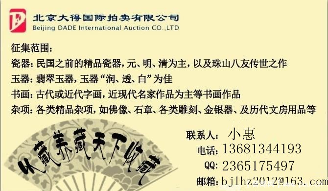邮件:送拍艺术品图片请传送到邮箱:bjlhz2012@163.com(请注明联系人及电话并及时通知)接收到您的图片后,会在二个工作日内答复您。为您提供方便快捷的销售竟拍服务,相信您和我们合作一定能将您的藏品价格高端化,在合作的同时会结识更多的藏友。我们凭着一支销售精英团队相信一定能给您一个满意的结果,期待广大藏友的咨询。