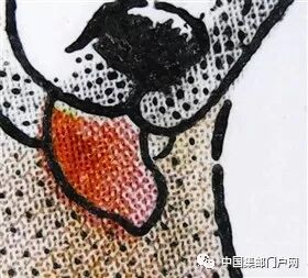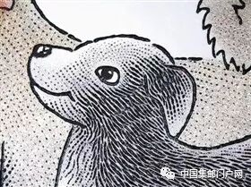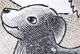 (1)雕刻版:通常是在钢版上由雕刻师按布线精雕细刻出的画面和文字,然后经过淬火使钢版硬化,再用母模复制成印版。雕刻版的主要特征有三:其一,在图案的雕刻技艺上;刀法精细,点线光洁清楚,深浅富于变化但不紊乱,形象逼真传神,墨层厚,刷色厚实,有较强的光泽,手摸有凸起感。其二,线条精细,图案和文字都非常清晰。其三,用雕刻线条的精细、深浅、疏密、长度和方向的不同变化,表现丰富的层次,艺术性强。像《戊戌年》特种邮票2-1“犬守平安”(图1),用手摸邮票正面,狗的黑色布线纹有凹凸感,再使用高倍放大镜观察狗的头颈部位,点线光洁清楚,深浅富于变化但不紊乱,眼珠墨层刷色厚实,形象逼真。又观察狗的尾部,线条精细、深浅、疏密、长度和方向的不同变化,表现出毛发丰富层次(图2)。