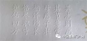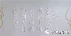 1。纸雕防伪。《戊戌年》特种邮票大版,边饰纸上的四言诗:“二〇一八,岁次戊戌。鸡栖于埘,灵犬通衢。狗列犬科,机警担当”与“其志则忠,其节非常。母慈子壮,福泽绵长。恪尽职守,护佑四方”的纸雕,利用显示性工具观察,非常清楚(图5),用专用滤色镜放大诗文中单个字,字体与纸浆结构融为一体,且纸面平整,字形凸出(图6)。其工艺形成标准,事后无论用什么方法去作伪,都无法做到完全达标。