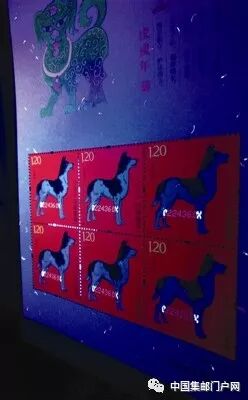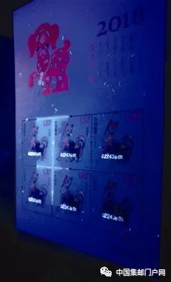 2。纸张防伪。《戊戌年》特种邮票的大小版,邮政沿用了上年度生肖专用的纸雕工艺和荧光颜色双重防伪的邮票纸,紫外灯下可以看到“正反变色和多色组合的荧光防伪纤维”。这两种防伪措施是由专用设备制造,具有发明专利,荧光颜色也是专门为中国邮政定制,不允许销售给其他客户。(图7)