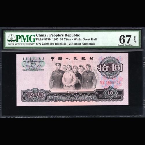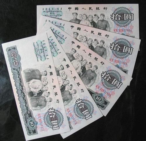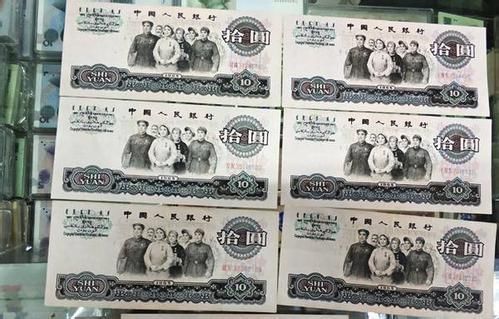 1965年10元人民币就是收藏市场上人们俗称的大团结,是第三套人民币中的老大哥。 这张人民币在1966年发行的,常见的有两种版本在市面上流通,分别是三罗马和二罗马。 1965年10元人民币票面长度是15.7厘米,宽度是7.2厘米。票面的长度在第三套人民币名列前茅。同样有名的10元人民币是53年的大黑十,虽然1965年10元没有前者那么春风得意,但是在收藏界也有自己的一席之地。先简单的介绍一下“大团结”吧! 【类别】第三套人民币 【发行时间】1966年1月10日 【停用时间】2000年7月1日 【纸币上的时间】1965年 【藏品面值】10元 【字冠字号】三冠 七号码/二冠 八号码 【正面图案】人民代表步出人民大会堂图 【票面尺寸】157x72 mm 【印刷工艺】正背面凹印 【特点】 1、正面左侧空白处有天安门固定水印。 2、三字冠七位号码,发行较少。 3、发现有荧光油墨印刷,较少见。 4、暗记:背面天安门右侧华灯柱子右有“工”,华灯右上有“Z”;天安门左端边缘处有“人”。 5、正背面均印有“1965”年号。 大团结三版本不同的价格 1965年10元券共分为三个版本,分别是:二字冠八号码、三字冠七号码和荧光版。10元券同样的面额、图案,版别不同,价值也不同。 大团结三版本不同的价格 1965年10元券共分为三个版本,分别是:二字冠八号码、三字冠七号码和荧光版。10元券同样的面额、图案,版别不同,价值也不同。 目前在钱币收藏市场上,单枚全品相”大团结“的交易价分别是:二字冠八号码260元、三字冠七号码280元、荧光版300元到400元之间。 荧光版产生原因 大团结在发行后便出现了一些问题,纸币上彩墨成分中含有超标的“荧光粉”,这使得验钞机在工作的时候经常发出警报,但人工检测却并未发现假币,给人们的生活带来不便。于是国家采取未发行的10元三冠纸币就地封存,已发行的只收不付,秘密回收对策,使得其存世量很少。 其实,第三套人民币荧光大团结十元是在纸币印刷厂完全不知情的情况下生产出来并发行的特殊币种,并且是因为后来有供材厂为了油墨的快干避免纸币粘印,加了荧光粉。可是在荧光大团结十元99补号中依然发现少数粘印甚至透印现象的纸币,深度分析这些纸币后应该不算合格的纸币,也竟然被流出。情况虽然特殊,却成为第三套纸币中唯一有荧光的钱币。