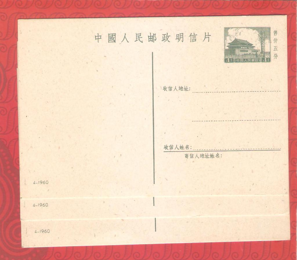 普9邮资片(4-1960有剪裁线)3片 ,标请付挂号信邮资5元【拍卖】