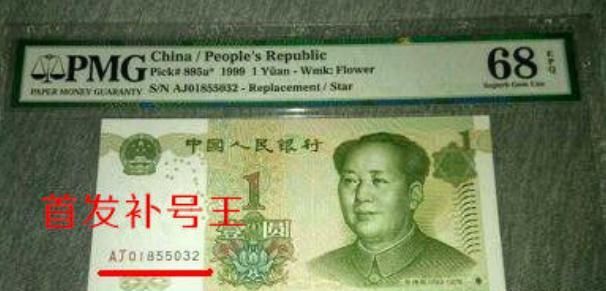 最贵的一元纸币和我们平时使用的纸币有那些不同呢?其实,它就是一元的补号,小编在以前的文章中都介绍过补号的含义,纸币在生产的时候会出现不同的补号,早期的补号价值都比较高,99年一元的补号王大家一定要看清楚了,冠字为英文字母“AJ”开头,它不仅是补号而且还是首发冠,价值更高