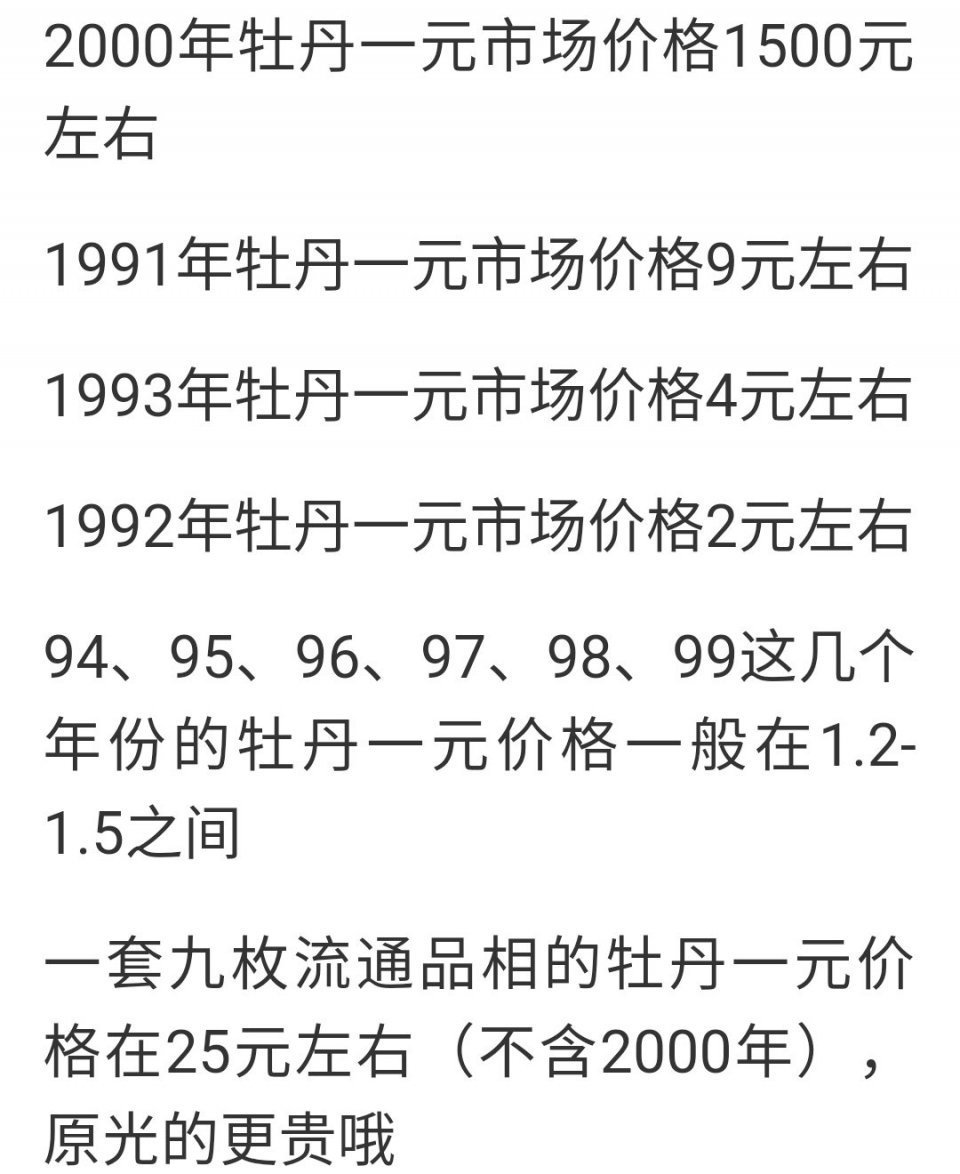 谈到这个一枚一元的硬币,根据图中的图片显示,是被广大藏友俗称为"老三花"中的牡丹一元硬币。 另外,不仅仅是这种牡丹一元已经不好找了,连所有的老三花都不好找了,连在菜市场摆地摊收钱币的小贩都在抱怨,收不到老三花了。如哪位的当地还有,建议收点放好。如果不信,请继续使用坐公交。这叫做信者则恒信,不信者则恒不信也。 这款牡丹一元硬币是从1991年至2000年共计发行十枚,其中一枚2000年牡丹一元没有公开发行流通币,故普通收藏一套的套装币就未将其入列。 笔者今天在这里重点想介绍的就是上图的这一枚,1991年牡丹一元,它们现在的确是升值了。说了这话以后,恐怕又会有人要吐槽了,又在吹牛??,又在炒作等等。只能这样,信我的你就留下,不信就请你继续用来坐公交。 按照题意重点介绍的就是作为这套牡丹一元?的龙头——1991年,它既然是龙头,就因为它发行最早损耗也最大,所以现在想去流通领域去找到这款币的机会已经很小了,找到好品相的就更难了。如不信,各位请自己亲自一试。 上面表格是笔者找来的市场参考价格??,供大家参考。从表格中可以看出此事并非虚言,而是有根据的。