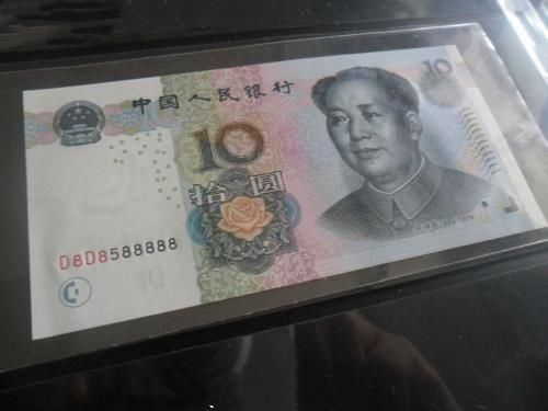 10元面值的人民币,大家见过不少,也只用过不少,不管是以前的第四套人民币里面的10元,还是如今市面上流通使用的第五套人民币里面的10元,都是大家比较熟悉的,虽然第四套人民币里面的10元纸币,属于旧版币了,但是也是有收藏价值的旧纸币,而如今使用的这种10元纸币里面,也有哦,下面就为大家说说其中一种。 在第五套人民币中,10元面值说大也不大,说小也不小,但在收藏界里面,对于纸币面值的大小,是没有刻意要求的,其重点就在于它是否有收藏价值,而在这种10元纸币里面,有99版和05版,但是今天要跟大家说的是,市面上常在使用的05版10元纸币,就是下面这张,大家请看仔细了! 上图中这张10元纸币,就是今天跟大家说的主角,大家可不要小看这张10元纸币,因为在这张10元纸币的正面上,出现了一种极具收藏价值的数字,而这组数字归纳于特殊号码,并且是特殊号码里面的五同号尾数8,对于这种数字的,大家都喜欢叫它老虎号,而上图中这张10元纸币里面,并没有数字4和7,像这种10元纸币,你如果花掉,等于花掉10张! 所以在这里,要奉劝各位读者,当你手里也有这样熟悉的10元纸币,切记,不能花掉它,那么你见过这样的10元纸币没呢?