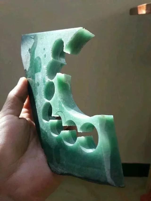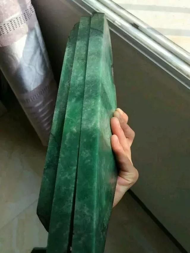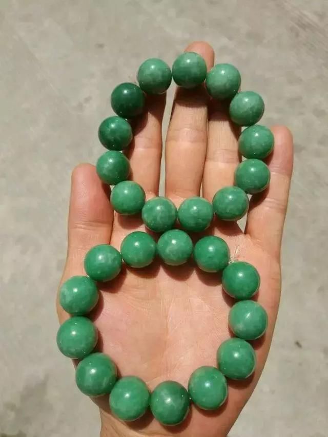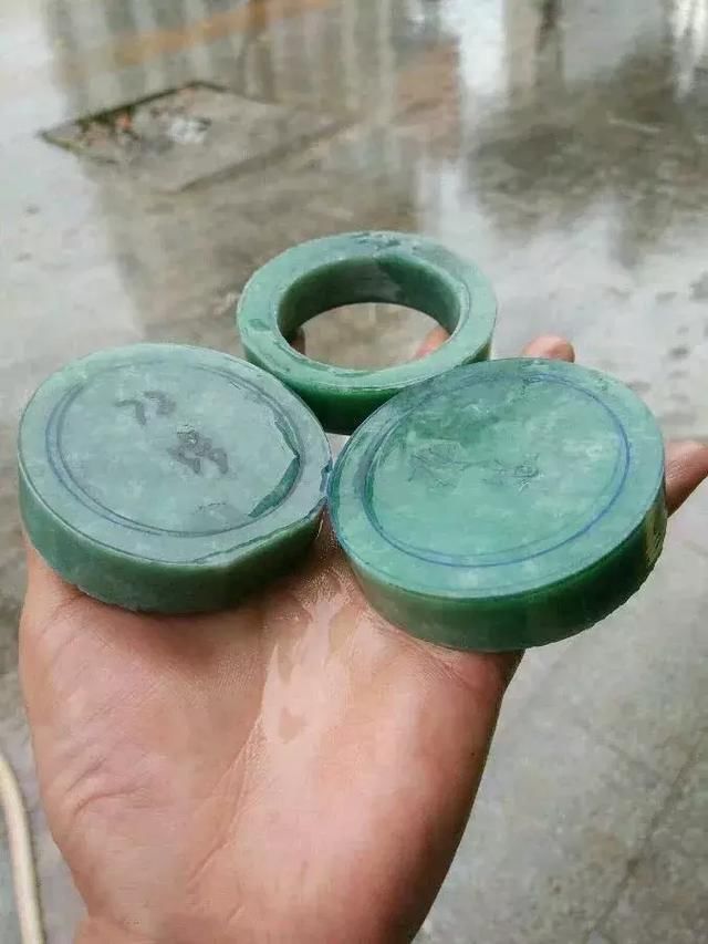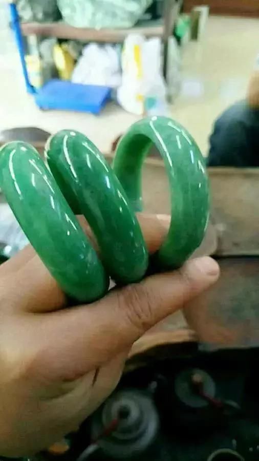 这块莫西沙原石,是从一个缅甸女人手上拿的,从看到石头到决定拿下,也就是一分钟的事,反正很喜欢,分析判断的结果是种老水长,皮紧沙细,可见石头正面开了一个小小的窗口,显示的色泽是非常浓郁的,期待切开后里面是满色的。 准备开切,黑石头赌性很大也比较难玩一点 ,很大几率要么一刀下去爆色,要么白茫茫一片,皮壳上怎么看也看不出有那么多的大裂,经验告诉我肯定有手镯的,不要慌! 切出三块满色翡翠,虽说色泽种质不算很好,但切出了满色也是不错的,还好不是白茫茫的一片,每一刀都切了三四十分钟,没看时间,老者在想,货主此刻心情如何。 我们开始取手镯 莫西沙出的石头的特点就是1.水头好 2.起货率高 3.种老 4.肉细 5.冰种玻璃种莫西沙这坑最多。他几乎包括了所有石头的优点,是赌石人最爱的场口,价格也非常高昂! 取出三条手镯剩下的手镯芯和边角料那可真的一点都不能浪费呀,挂件啥的也是个不错的选择,就等待抛光后的成品了。 种质是到了糯种,虽然不能说青翠欲滴,但还是十分鲜艳夺目的,虽然质地略粗,种水上没有优势可言,但颜色清淡,继续看下去把。 打磨抛光过后的手镯,满绿糯种表现,虽有那么一点点棉的掺杂,但种很老底色纯正,玉质冰莹细致,水润起胶感,完全可以忽略,这样的色泽却也毫不逊于其他翡翠! 剩下一下料子,货主没有取牌子挂件,而是选择了车珠子。 自然光下,没有什么水头和透光度,但颜色浓郁散发出鲜鲜的绿意,让人一见倾心,别具一格的美感! 其实无论什么种,翡翠只需带上绿色,价值就可以升很高,毕竟中国人买翡翠,第一还是看色,而且色好的翡翠比种水好的翡翠还少。