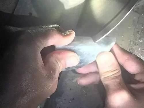 在自然光下,肉质显得非常的发黑,种已经相当的老了。师傅说,如果这块石头能出戒面的话,那么市场值至少在六位数。但是现在还不能完全的下定论,切完才可以。于是,小哥就决定把下面的石头也切开,赌一赌自己的运气。