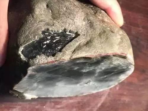 最后小伙将之拿下了,给完钱后小伙让师傅先开个窗看看。如图所示,窗口的位置底子非常的干净,而且种老,属于玻璃种。