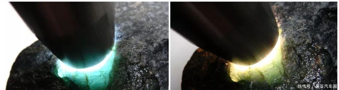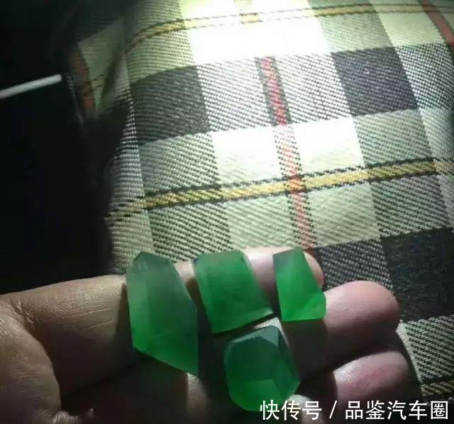 再来看一块充满神秘的后江小料。 个头这么迷你,差不多就鸡蛋那么大,还是块全蒙料,打光照射大概看得出里面的情况。 随随便擦窗一看,都是块好料,水色绝佳,切涨都是毋庸置疑! 切开再看看,我都有点不敢相信,鸡蛋大小的料子被一分为四,每一份都堪称完美。 这下看得更清楚,高冰阳绿,种老通透,无纹无裂,虽在暗光下,却一点也不影响它展现自己的种色。 忍不住要想象它被做成成品的样子。 赌石有风险,下手需谨慎!