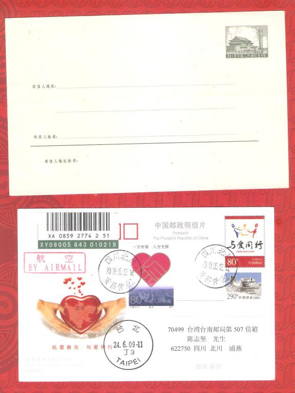 普9天安门图邮资实寄封11-1965新、与爱同行实寄明信片两件。【拍卖】