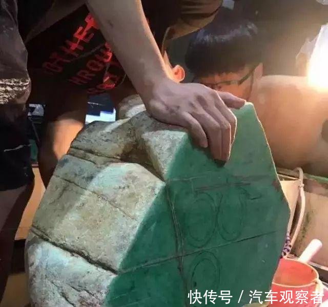 原石体积很大,从切面上看有几条大裂,俗话说:“不怕大裂怕小绺”,庆幸的是,这些只是大裂,没有小裂,对取手镯的影响不大,货主沿着原石的纹裂开始绘画手镯圈,确保最大限度的利用原料。