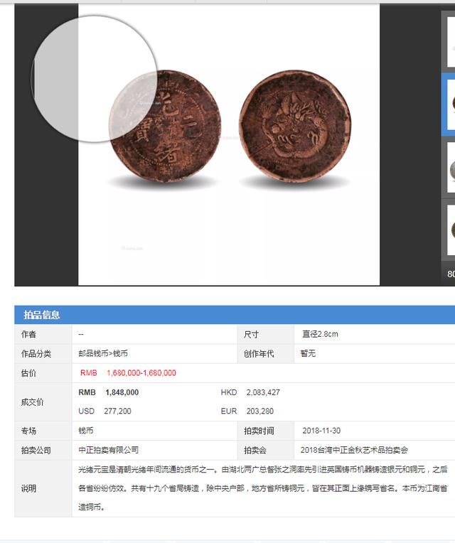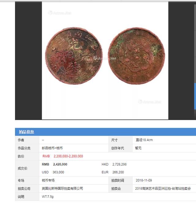 江南省造的光绪元宝不管成交记录或者成交价格都是非常可观的。现有一枚江南省造光绪元宝铜币即将于美国哈佛拍卖行上拍,时间为2019一月份13日,敬请期待稀有光绪元宝的现世!!