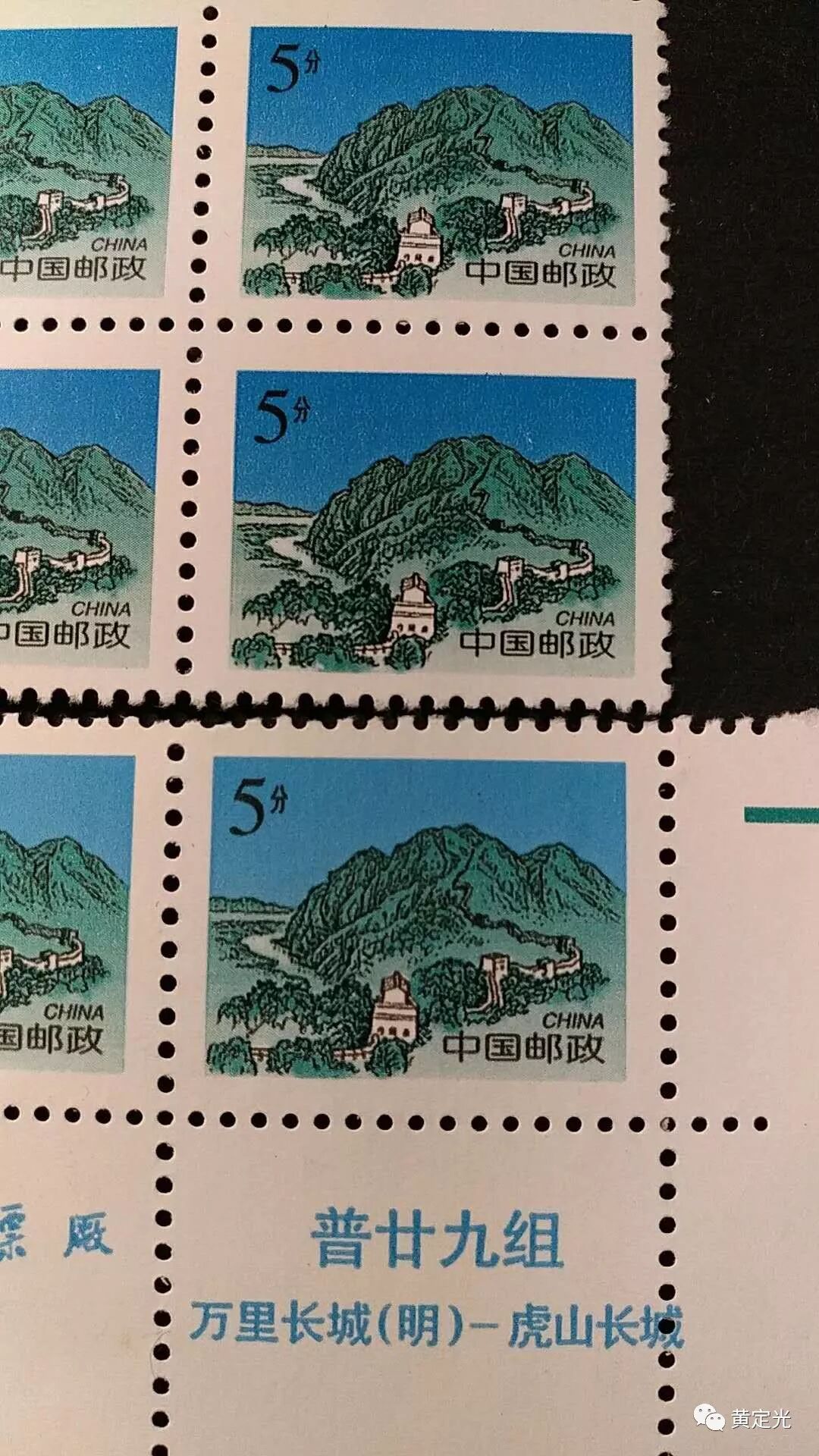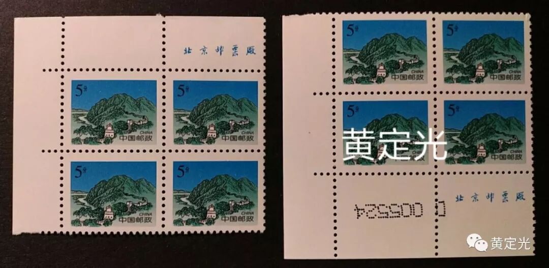 这个新的品种就是5分虎山长城的电喷码品种,这个票的特点是在整版左下角有数字D+6位数字喷码,印刷质量较原发行的品种,印刷质量更高,邮票图案更加清晰,细节出可以看到印刷网点,邮票图案背景天空更蓝,“中国邮政CHINA”字体更加清晰,分辨率更高。