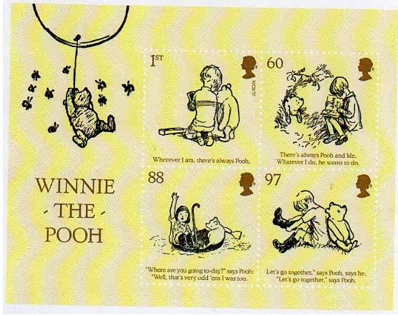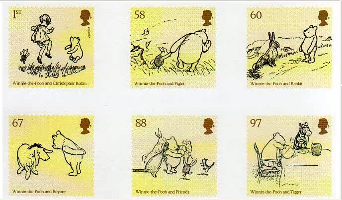代办10月12日英国儿童题材"小熊维尼"系列新邮首日寄 Children's Literature: Winnie-the-Pooh by A A Milne - Europa / CEPT issue - 12 October 2010 The Europa theme this year is Children's Literature and Royal Mail is celebrating these events with a set of six Stamps and a special Miniature Sheet depicting characters and text from the Winnie-the-Pooh story by A A Milne, featuring original illustrations by E H Shepard. 2010年10月12日,英国皇家发行一套六枚以孩子们的文学作品为题材的邮票------小熊维尼全套六枚及相应的小型张一枚.邮票的画面图案及文字源自原著.作者:A A Milne.插图:E H Shepard Miniature Sheet featuring Winnie-the-Pooh and Christopher Robin, preproduces lines from the famous poem, "Us Two" 小型张维尼与罗宾画面文字对话源自诗-----我们俩 1st class* - Wherever I am, there's always Pooh 1ST----无论我在哪儿,哪儿都有维尼 60p - There's always Pooh and Me. Whatever I do, he wants to do, 60P----无论我做什么,维尼也做什么,我们如影随行 88p - "Where are you going t-day?" says Pooh: "Well, that's very odd 'cos I was too. 88P----"今天去哪儿" 97p - Let's go together", says Pooh, says he.