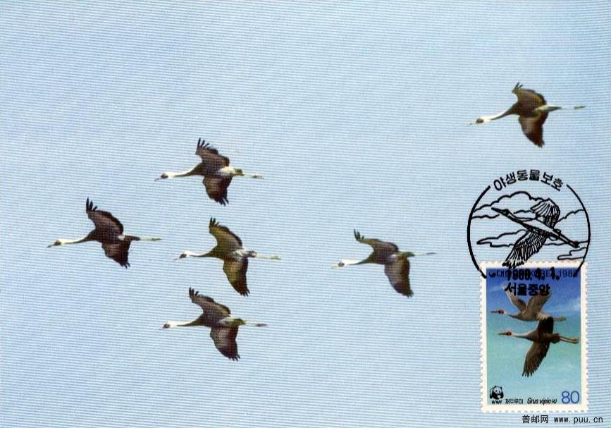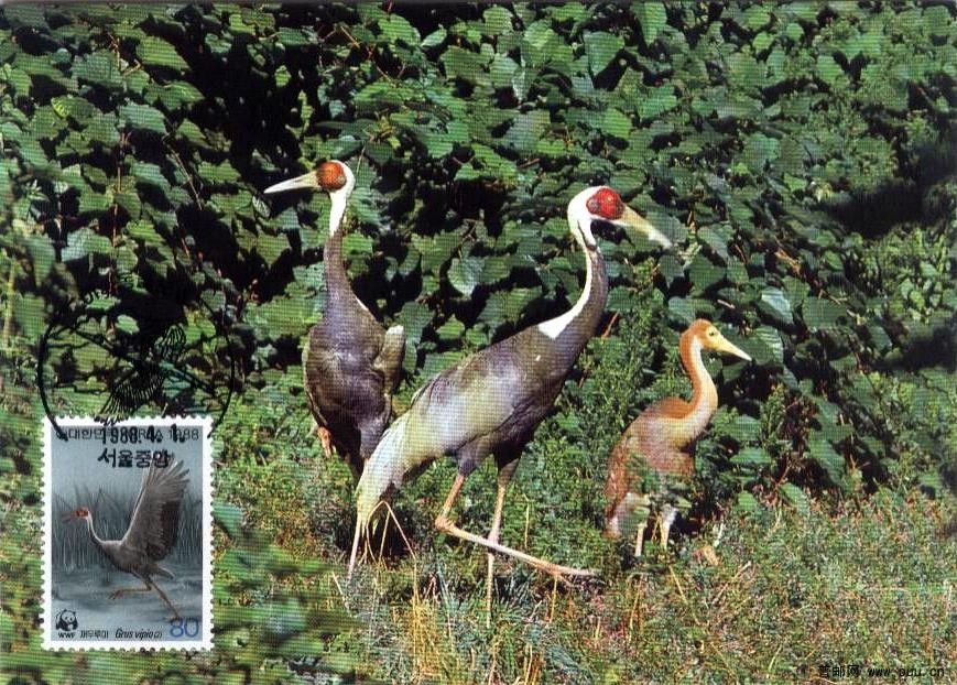 韩国邮政198841日发行了《白枕鹤》邮票一套四枚(连张),面值均为80w,分别为:鸣叫欲飞展翅比翼。该套邮票为胶版,齿孔13,邮票规格26×36.5mm,整版20枚(5套邮票),发行量为150万套。同时WWF组织制作了四枚极限片