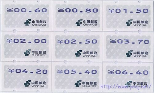 PS: 1. 中國【自1】電子郵票試用後,第一次換色帶時誤裝藍色色帶而產生所謂的【藍電子】,時間約