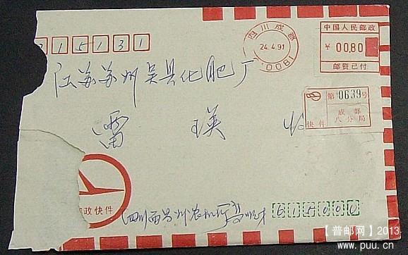 [邮资机戳] 1991年成都八支局使用无戳头邮资机戳快件实寄封 |