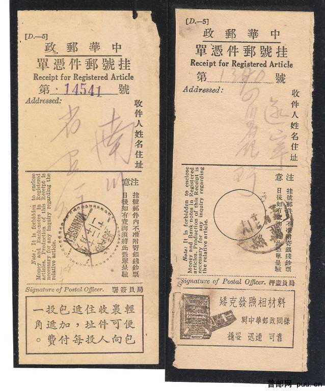 【拍卖】中华邮政挂号凭单2件 (拍品编号:6713)