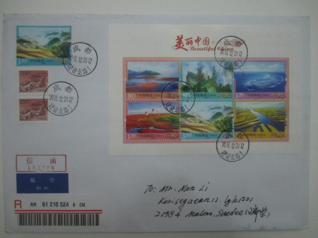【拍卖】12月20日《美丽中国小全张》成都挂号邮寄瑞典附带机打收据 (拍品编号:6909)